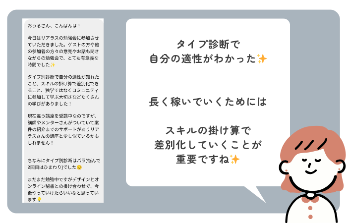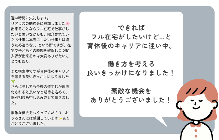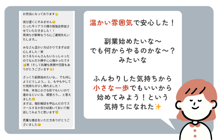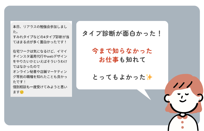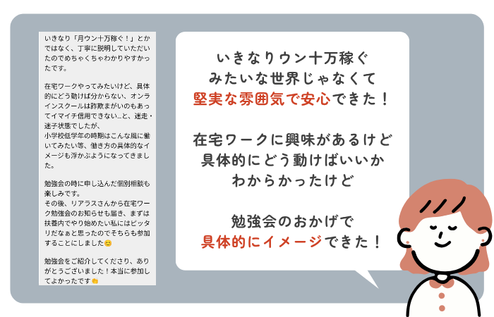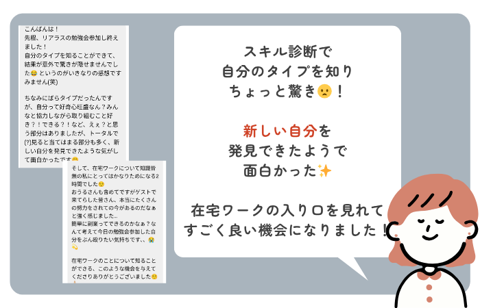 在宅ワーク系セミナーって有象無象で怪しいのもあるんだけど、リアラスなの勉強会から、安心してみんなに受けてもらえるなと自信を持ってます📝