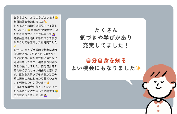 勉強会の序盤でタイプ診断を行います。その時だけ一瞬スマホ見てもらえると嬉しいな!