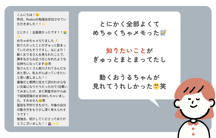 リアラスは立ち上げからながーーーーく中を見てたので、本当によくスクールのことは知ってます!めちゃくちゃ優しくて、実績もある方たちが講師なので、今回の勉強会も本当に学びになることばかりだと思います✨